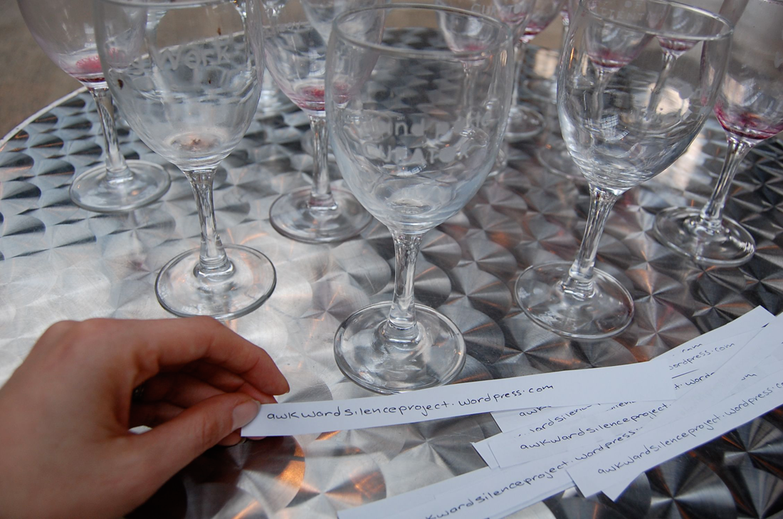 Awkward Silence (2008 – ongoing) is an ongoing project that mediates between conversations and social rituals within the contemporary art setting. Awkward Silence aims to operate within the social construct of art gatherings, the most common being the exhibition opening.