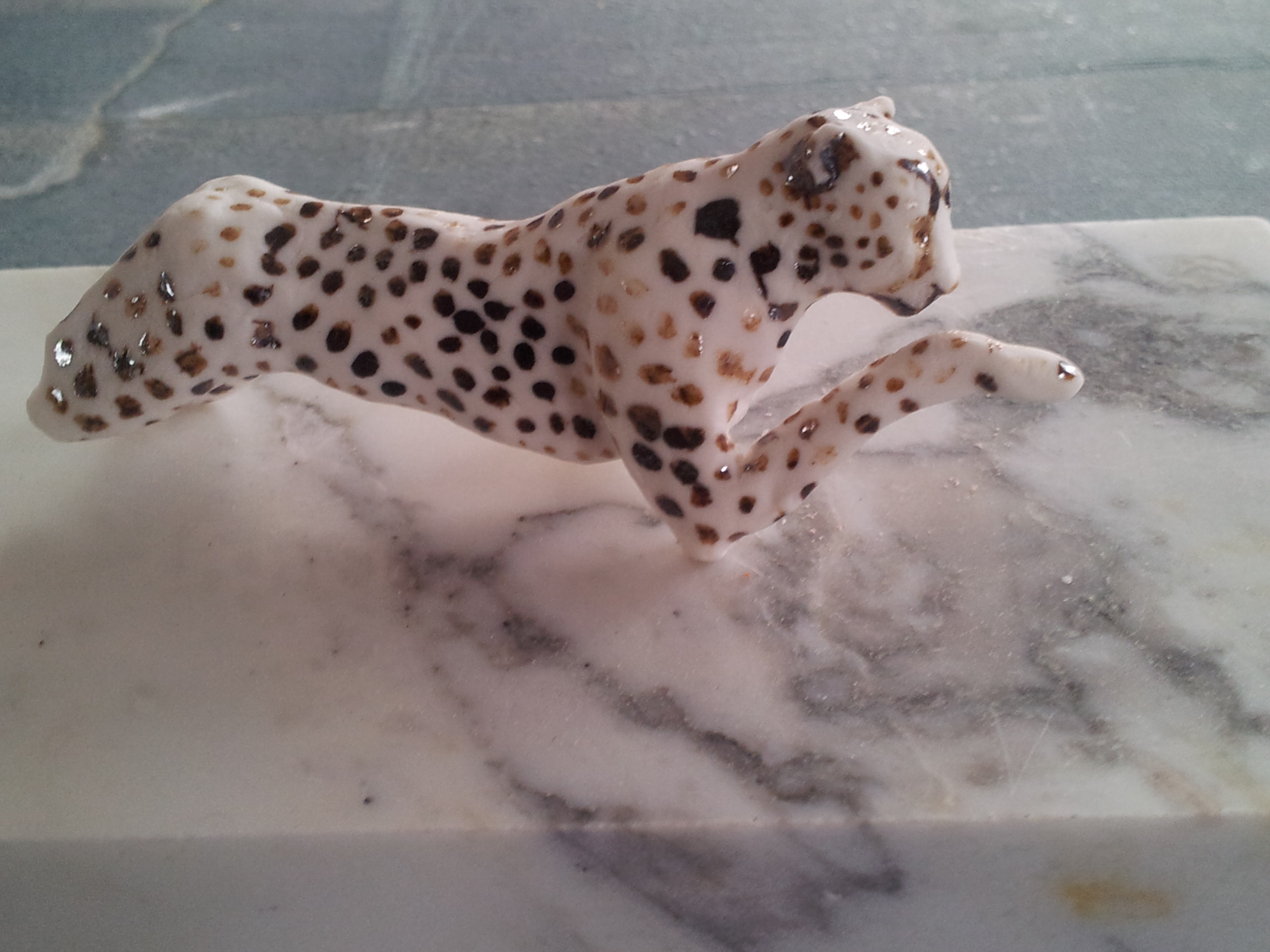 The glazes turned out lumpier than I would have liked – due to my clumsy application. But I was particularly pleased with the bronze metallic looking glaze that Somchai conjured up, as it lay on naked fired white porcelain. The porcelain looks very glassy and the glaze very metal like and shiny. I could do something jewel like with the cheetah, perhaps adding a garnet for a heart later. Oh, but I would have to cut the raw garnet, polish it and fit it to the body: more long process work.