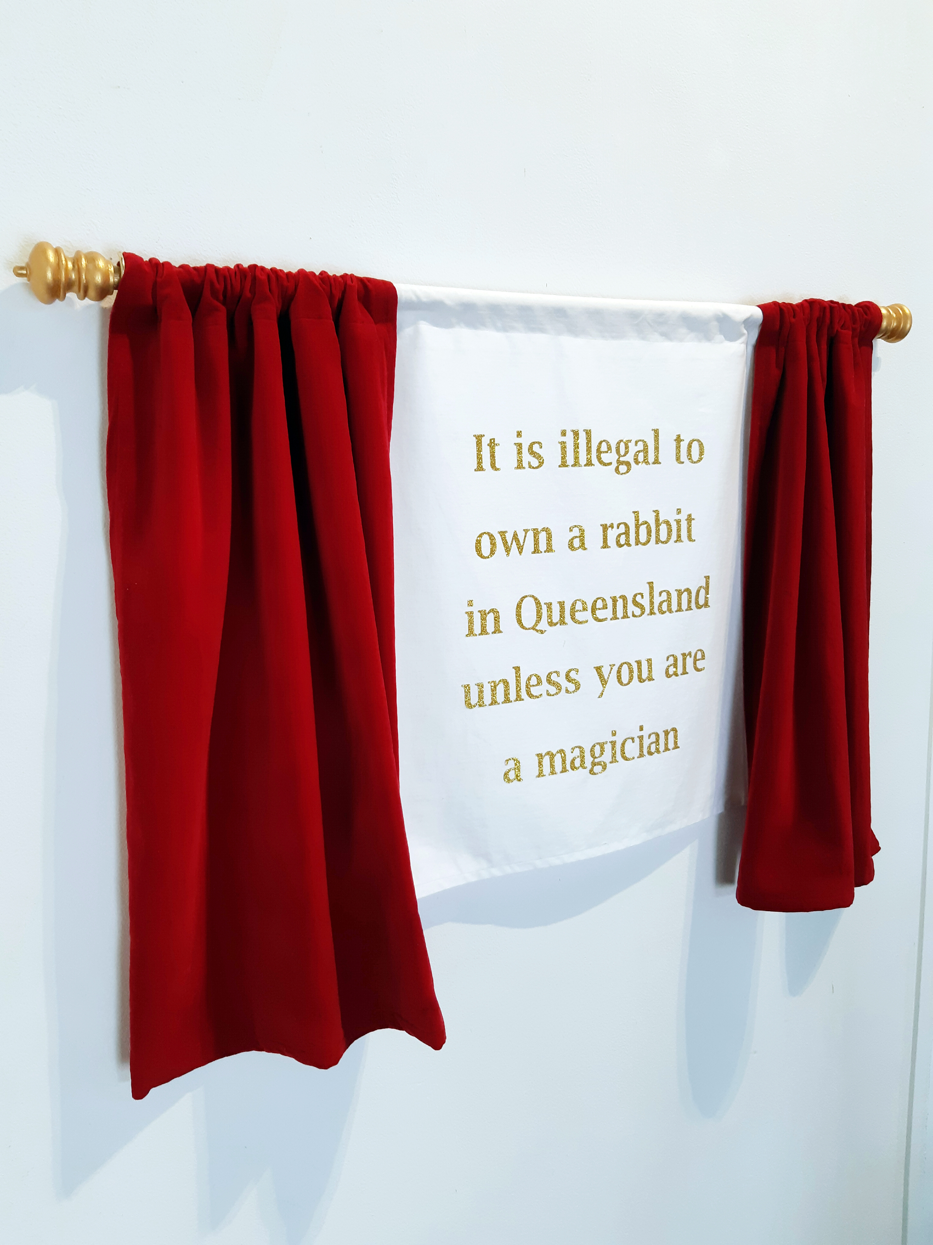 Human Act (2019) points to the European introduction of rabbits to Australia and its disastrous legacy to biodiversity. This work aims to consider how human activity such as overgrazing, recreational hunting and our regulated and domesticated version of wildlife frames our relation to other species. The text within the work reads, ‘It is illegal to own a rabbit in Queensland unless you are a magician’. This statement is derived from the Queensland Biosecurity Act 2014*, which limits permits for domestic rabbits for purposes of public display, magic acts and circuses.